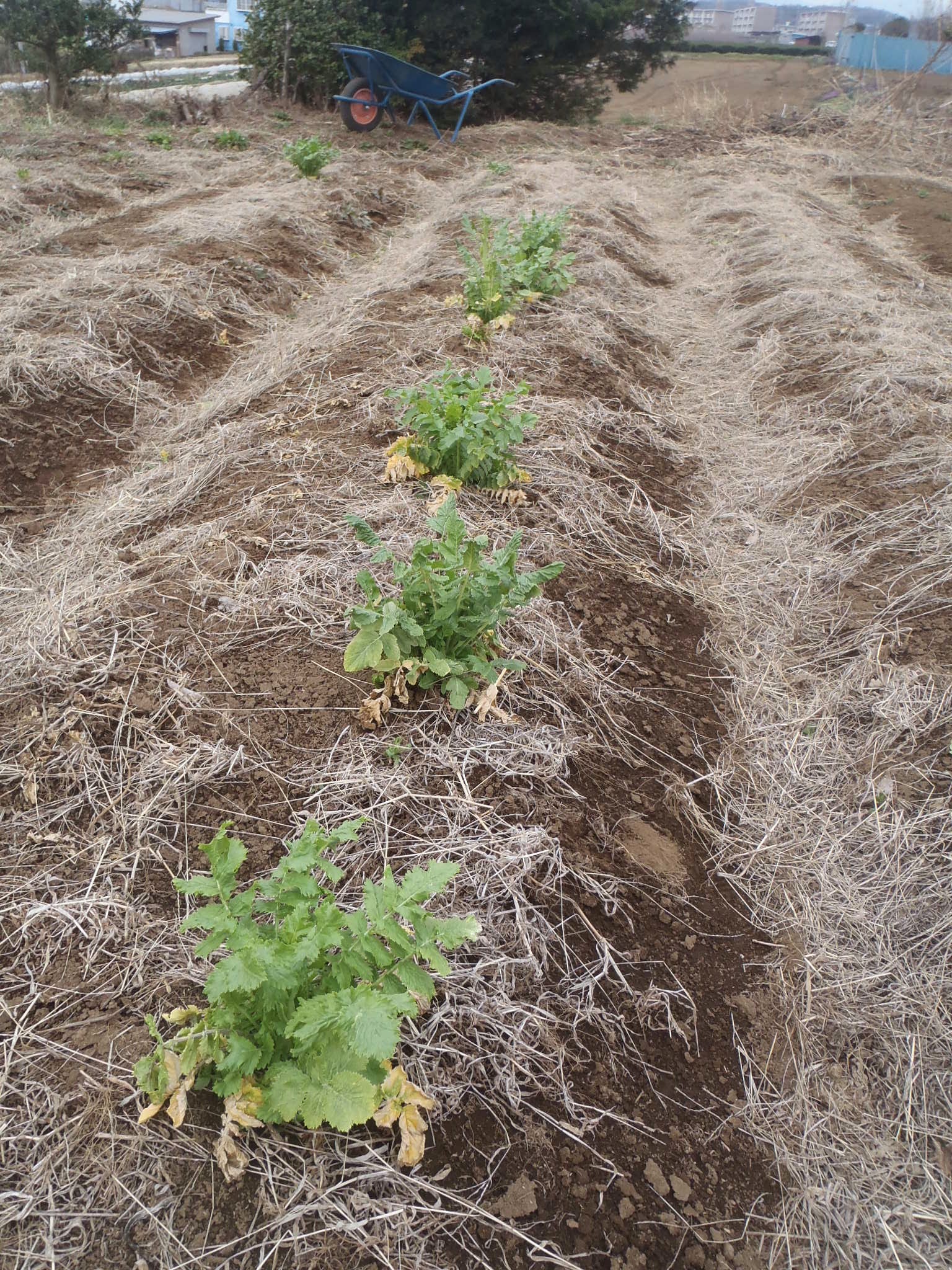 種取り用の源助大根とみやま小カブ。小カブは花が咲き始めました。