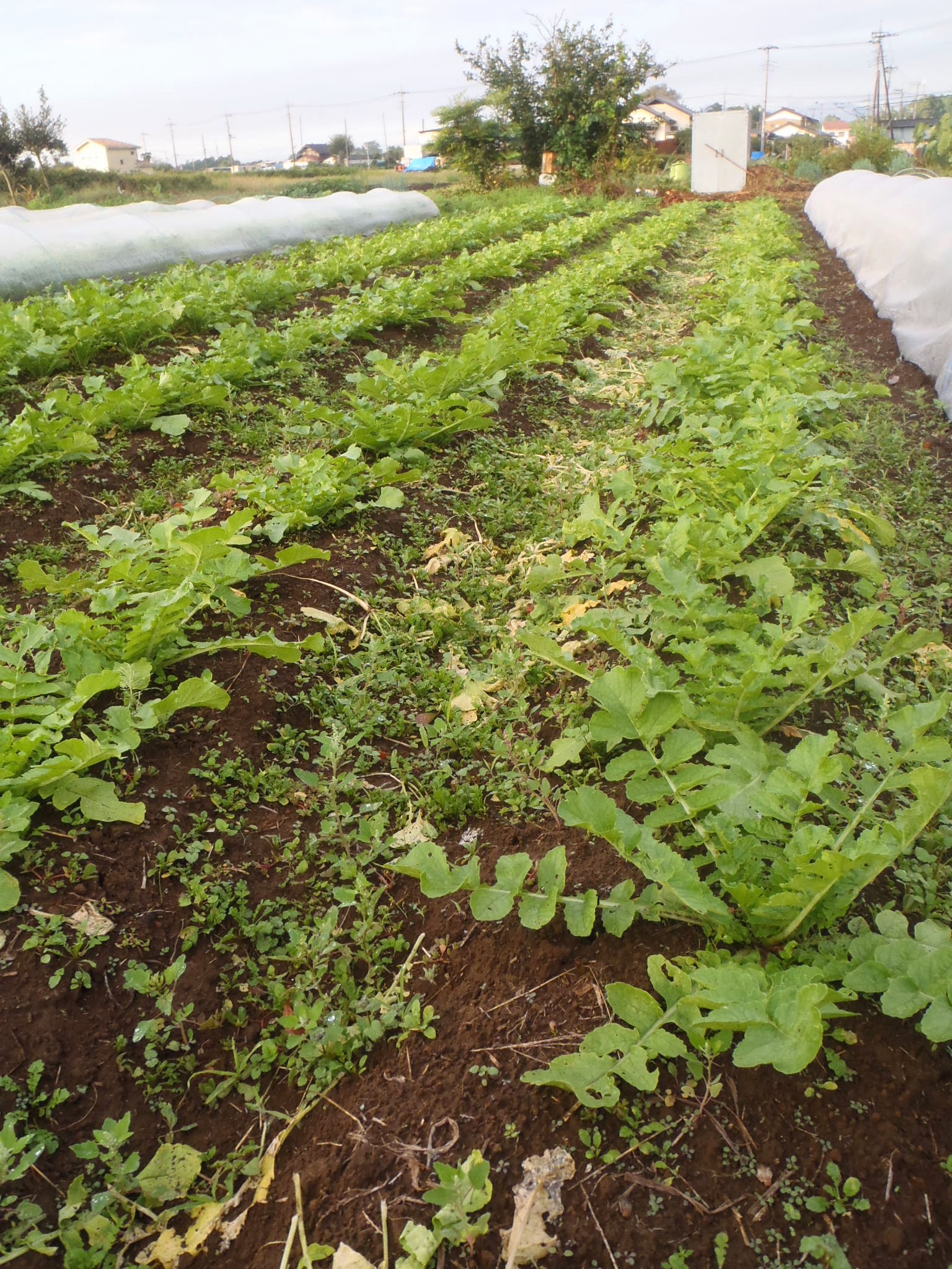 小松菜。9/13播き。結構大きくなっていますが、まだやわらかい。この畝は20cm間隔に間引いて、春の菜花用にする予定です。