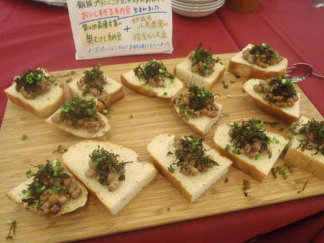 12月に招待状が届いて「そうだ!」と思いつきました。第4回で最優秀賞に輝いて、その後納豆屋さんになった「ゆきちゃん納豆本舗」の「奥むさし納豆」と第8回の私ののらぼう油を、イーズパッションさんにお料理にしてもらおう!ということです。生産者と、加工者と、飲食店とのコラボ、面白すぎ!さっそく、主催者の飯能信用金庫の担当の方にお電話すると、レセプションで料理を持って行ってもOKとのこと。さらに、イーズパッションさんに「何か納豆料理を出してほしいのですが」と相談すると、「いいですよー」と快いお返事。後日、納豆はそのまま食べるのが一番なのでと、「パンの上に納豆を載せることにしましょう」とシンプルで食べやすいお料理にしていただきました。